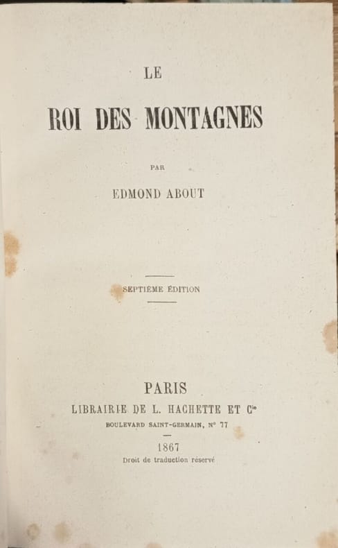 Librairie Hachette et Cie 1876 301 pages in12. 1876. reliure éditeur demi chagrin dos à nerfs. 301 pages. Le Roi des montagnes est un roman d'Edmond About publié en 1876 chez Hachette. Il s'agit d'une aventure humoristique et satirique se déroulant en Grèce mettant en scène un brigand nommé Hadgi-Stavros qui se fait appeler le "Roi des montagnes"