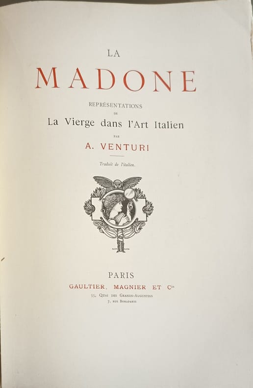 GAULTIER MAGNIER ET Cie 444 pages in8. Sans date. cartonnage éditeur. 444 pages. Ouvrage de l'historien d'art italien Adolfo Venturi publié originellement en 1902 qui étudie les représentations de la Vierge Marie (la Madone) dans l'art italien. L'auteur analyse les œuvres de grands maîtres comme Giotto Botticelli Raphaël et Michel-Ange en examinant non seulement leur composition mais aussi leur valeur esthétique et leur évolution symbolique depuis les catacombes