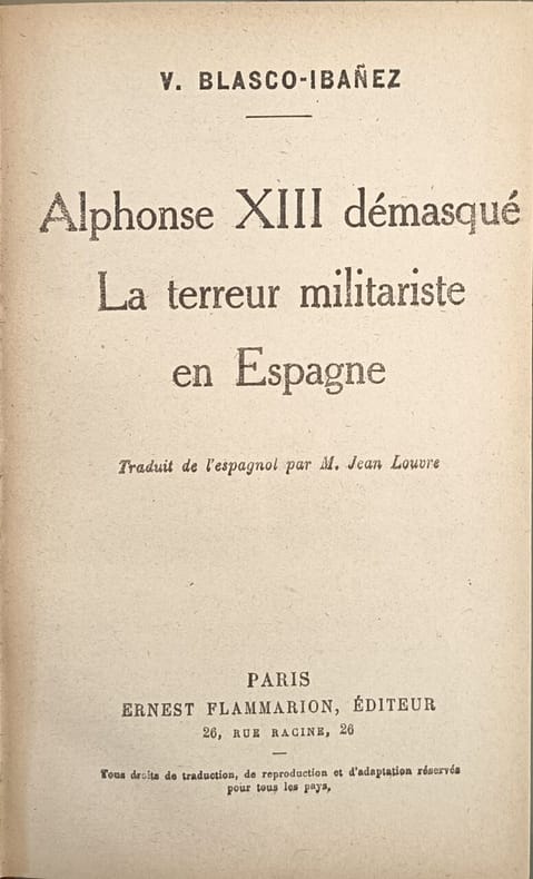 Ernest Flammarion 461 pages in8. Sans date. reliure éditeur demi basane dos à nerfs. 461 pages. Pamphlet politique écrit par Vicente Blasco Ibáñez durant son exil qui dénonce vigoureusement le roi Alphonse XIII et la dictature militaire de Primo de Rivera en Espagne dans les années 1920. L'ouvrage présenté comme un cri républicain accuse le monarque d'hériter des défauts de ses ancêtres et de perpétuer un régime de terreur