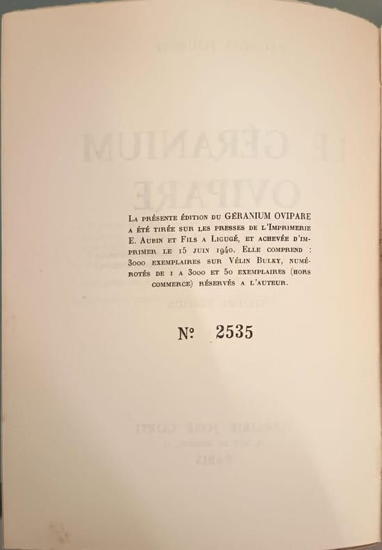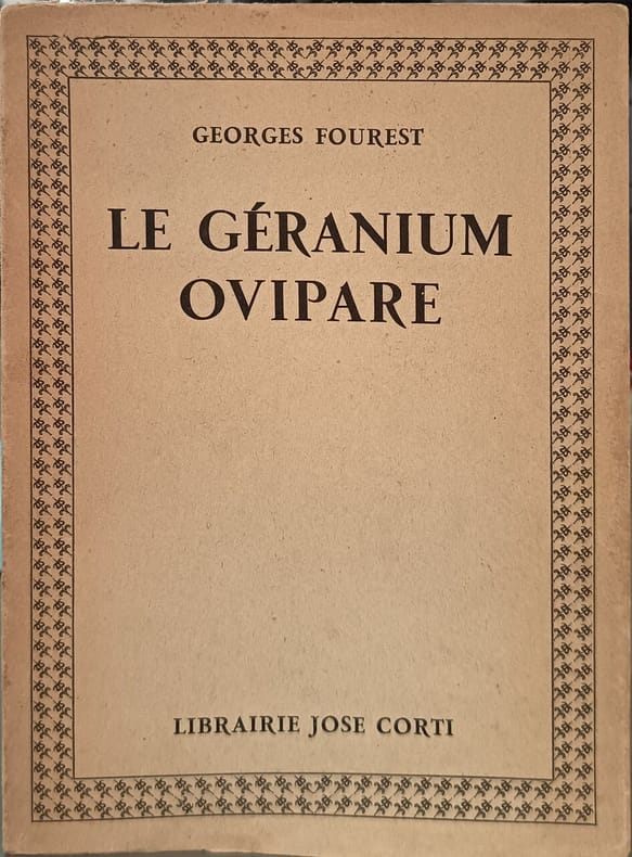 Librairie Jose Corti 1940 116 pages in8. 1940. broché. 116 pages. Le Géranium ovipare est un recueil de poésie de Georges Fourest publié en 1935 caractérisé par un humour potache un ton féroce et comique et un univers décalé mêlant réalité et imaginaire. Il représente une voix singulière et drôle dans la littérature française de la première moitié du XXe siècle