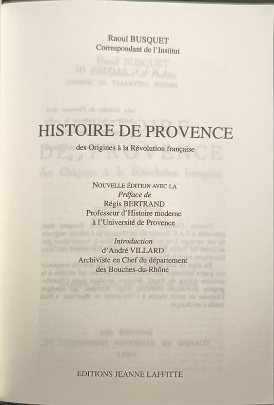 Par Max Escalon de Fonton, Jean-Rémy Palanque, Edouard Baratier, Félix Reynaud, André Bourde, Michel Vovelle, Maurice Agulhon, Pierre Guiral et Louis Pierrein. — "Cet ouvrage, fruit d'un travail d'équipe, est remarquable par sa composition équilibrée puisque, sur 604 pages, 137 sont consacrées à la Préhistoire et à l'Antiquité, 118 au Moyen Age, 175 aux temps modernes et 165 à l'époque contemporaine. Chaque chapitre est suivi d'une copieuse orientation bibliographique ; le volume comporte une bonne table (grandes dates de l'histoire de Provence) et, dans les pages de gardes, une carte de la Provence dépouillée mais fort suggestive ; un index d'une vingtaine de pages (hommes et lieux de Provence) en fait un instrument de travail des plus commodes dont la consultation est rendue encore plus agréable par une typographie reposante pour les yeux, une illustration abondante et soignée, judicieusement choisie parmi des gravures et des documents d'époque. Le plan chronologique suivi replace dans un cadre plus vaste l'histoire de la Provence et en dégage, avec de netteté, les grandes lignes de force..." (R. J. Bernard, Revue d’Histoire moderne et contemporaine, 1973)