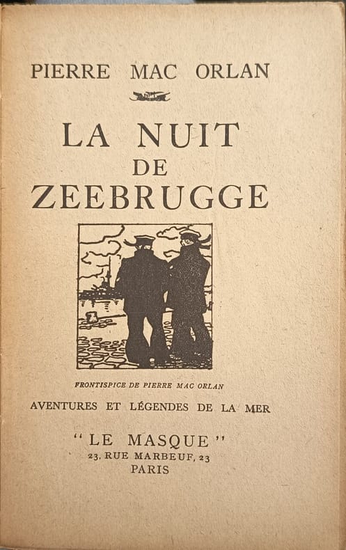 Le Masque 1934 221 pages in8. 1934. Broché avec jaquette. 221 pages. Un Français revenant dans la région de Zeebrugge vers 1907 séjourne dans un petit hôtel à Heyst. Il écoute le patron et un marin évoquer la terrible nuit du 22 avril 1918 où trois navires britanniques furent détruits sous un feu nourri des batteries allemandes. Le récit capture l'ambiance particulière de la région et de ses habitants