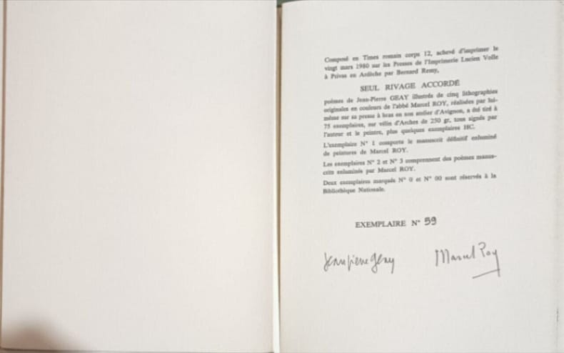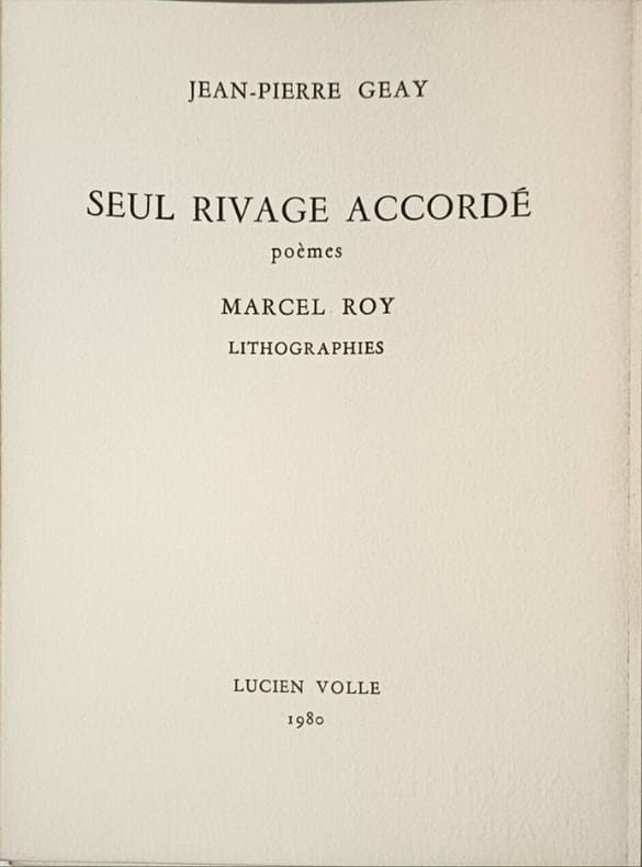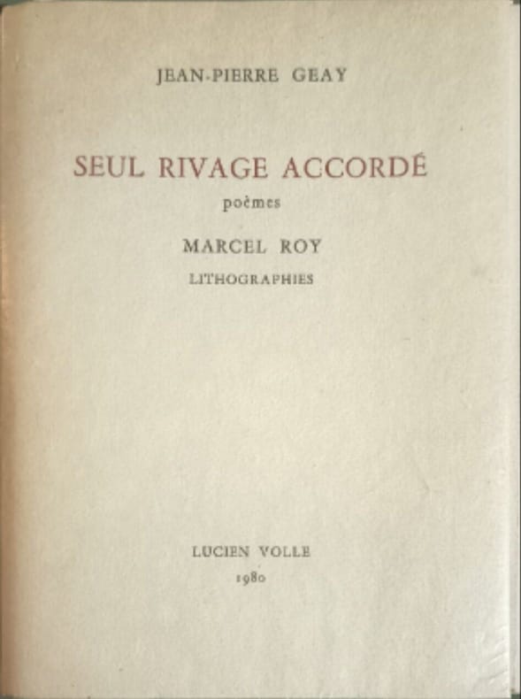 Lucien Volle 1980 non paginé pages in8. 1980. en feuillet couverture sous papier cristal. non paginé pages. Seul rivage accordé est un recueil de poèmes de Jean-Pierre Geay illustré par des lithographies en couleurs de Marcel Roy. L'ouvrage s'inscrit dans la tradition du livre d'artiste fruit d'une collaboration entre un poète et un artiste contemporain. Des brouillons et documents d'archive témoignent du processus créatif et de l'histoire de cette édition