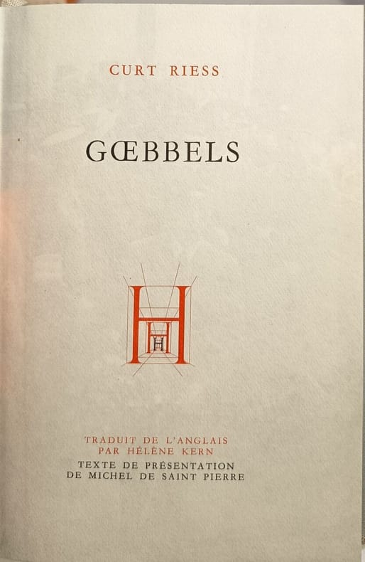 Club des amis du livre 1962 285 pages in8. 1962. reliure editeur sous rodhoid. 285 pages. Biographie de Joseph Goebbels ministre de la Propagande nazi écrite par Curt Riess un journaliste juif allemand exilé. L'ouvrage explore les aspects psychologiques de son personnage comme ses insécurités ses rivalités et son obsession pour le sexe et analyse son rôle clé au sein du régime nazi. Il s'agit d'une édition richement illustrée de photos en noir et blanc numérotée et publiée par le Club des Amis du Livre en 1962