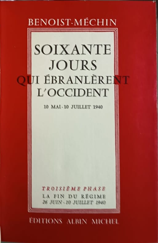 ÉDITIONS ALBIN MICHEL 1956 685 pages in8. 1956. reliure éditeur demi basane dos à nerfs. 685 pages. Cet ouvrage en trois tomes de Jacques Benoist-Méchin offre une analyse minutieuse et détaillée des soixante jours cruciaux (10 mai - 10 juillet 1940) de la bataille du Nord pendant la Seconde Guerre mondiale. Il relate au jour le jour cette tragédie en croisant les situations politique et militaire cherchant à démontrer le caractère total de la défaite française et l'inévitabilité de l'armistice franco-allemand tout en reflétant la fascination de l'auteur pour la puissance allemande et Adolf Hitler