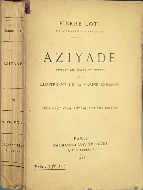 Calmann-Lévy 1925 317 pages in12. 1925. broché. 317 pages. Premier roman de Pierre Loti Aziyadé raconte l'histoire d'amour entre un officier de marine européen (le narrateur nommé Loti) et Aziyadé une jeune Circassienne enfermée dans un harem à Salonique puis à Istanbul en 1876-1877. Ce roman d'inspiration autobiographique publié anonymement en 1879 chez Calmann-Lévy plonge le lecteur dans l'exotisme de la Turquie ottomane pendant la crise des Balkans