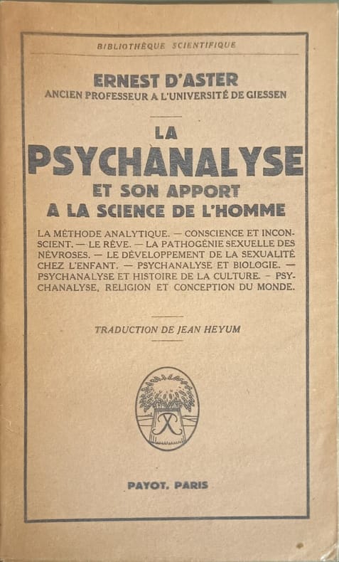 Payot 1951 201 pages in8. 1951. broché. 201 pages. Cet ouvrage d'Ernest d'Aster (Ernst von Aster) examine l'apport de la psychanalyse à la science de l'homme en abordant des thèmes fondamentaux comme la méthode analytique la conscience et l'inconscient le rêve la pathogénie sexuelle des névroses le développement de la sexualité infantile ainsi que les relations de la psychanalyse avec la biologie l'histoire de la culture la religion et les conceptions du monde