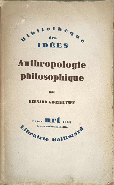 Librairie Gallimard 1952 284 pages in8. 1952. broché. 284 pages. Cet ouvrage de Bernard Groethuysen propose une étude historique de l'anthropologie philosophique examinant les conceptions de l'homme de Platon à Montaigne en passant par la pensée chrétienne. Il explore comment le 'je vis' précède le 'je pense' et analyse la gradation des valeurs bourgeoises ainsi que l'évolution de la pensée moderne