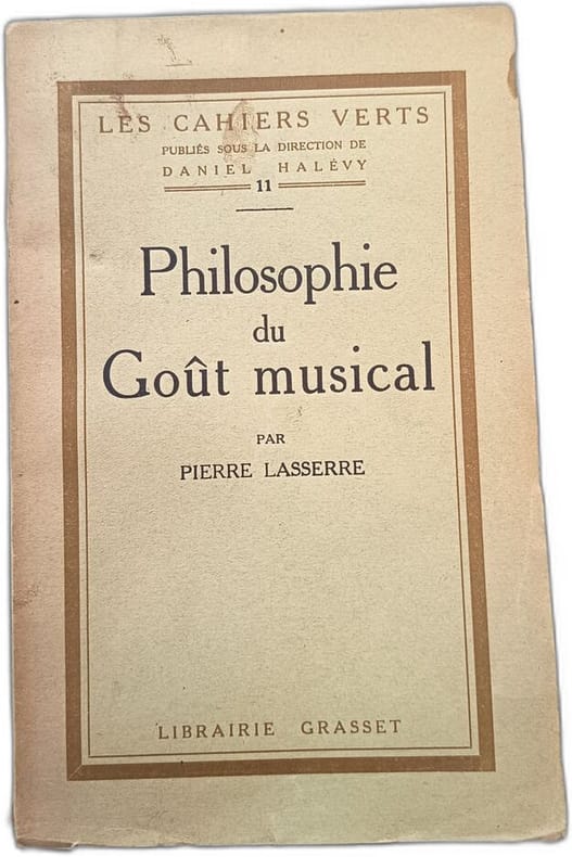 Librairie Grasset 1922 147 pages collection les cahiers verts. in12. 1922. broché. 147 pages. Traité philosophique publié en 1922 qui explore les fondements esthétiques de la musique à travers une réflexion sur l'inspiration la vérité expressive et l'évolution des formes musicales. L'ouvrage s'interroge sur l'existence d'un goût musical universel et examine les courants de pensée caractéristiques de son époque