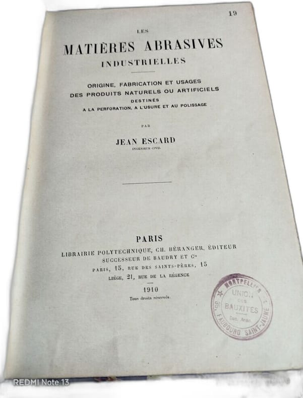 Beranger 1910 169 pages in8. 1910. reliure demi-toile. première édition. 169 pages. Ouvrage technique de 1910 de Jean Escard traitant de l'origine de la fabrication et des usages des matières abrasives industrielles naturelles ou artificielles utilisées pour la perforation l'usure et le polissage