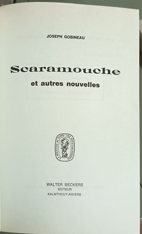 Walter beckers 1969 262 pages in8. 1969. reliure editeur. 262 pages. Recueil de nouvelles de Joseph Arthur de Gobineau auteur français du XIXe siècle. L'ouvrage comprend notamment la nouvelle 'Scaramouche' une farce amoureuse explorant les jeux de pouvoir et les masques sociaux ainsi que 'Mademoiselle Irnois' qui analyse les relations familiales et les attentes sociétales. Le style est décrit comme suranné désuet avec de l'humour et une galerie de portraits jubilatoires