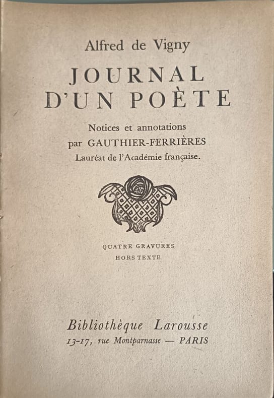 Larousse 1919 210 pages in8. 1919. Broché couverture rempliée. 210 pages. Le Journal d'un poète d'Alfred de Vigny est un recueil de réflexions jugements et considérations personnelles de l'auteur présentées dans l'ordre chronologique. Il offre un reflet historique de sa vie avec un style aérien et un rythme constant révélant la part la plus choisie de ses idées qui ont servi de point de départ à son œuvre littéraire