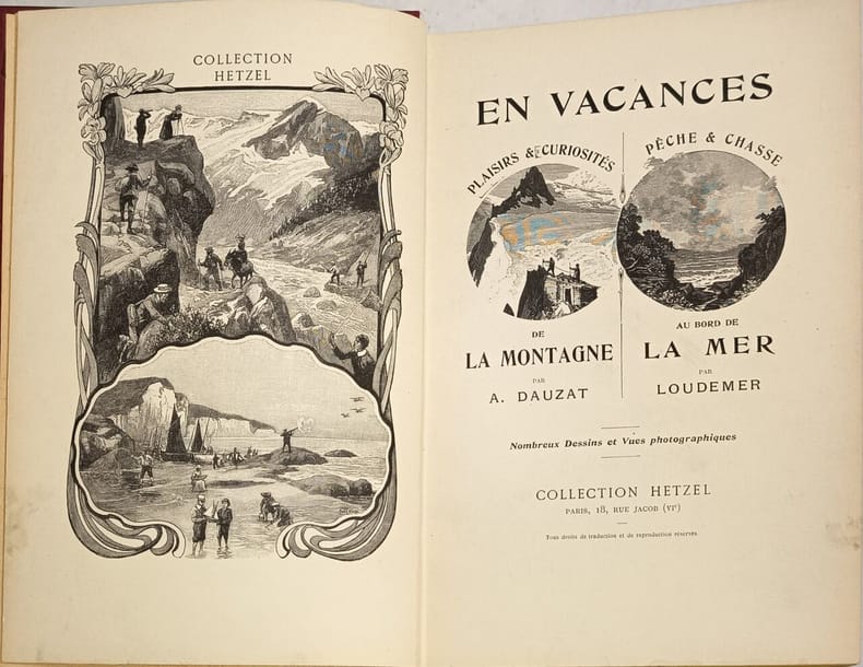 Hetzel 1909 127 pages in8. 1909. reliure editeur. 127 pages. Ce livre intitulé 'En vacances. Plaisirs & curiosités de la montagne' est un guide illustré de la collection Hetzel publié vers 1909. Il décrit les plaisirs et curiosités des vacances à la montagne accompagné de nombreux dessins et photographies en noir et blanc. Il est souvent relié avec un autre ouvrage sur la mer du même éditeur