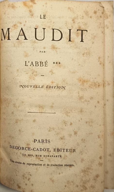 Degorce-cadot éditeur 1876 in8. 1876. reliure éditeur demi basane dos à nerfs. 3 volume(s). première édition. Le Maudit est un roman français du 19ème siècle écrit par un auteur ecclésiastique (l'abbé ***). Il s'agit d'une œuvre de fiction avec une suite intitulée "La religieuse" publiée en trois tomes et faisant partie du patrimoine littéraire français