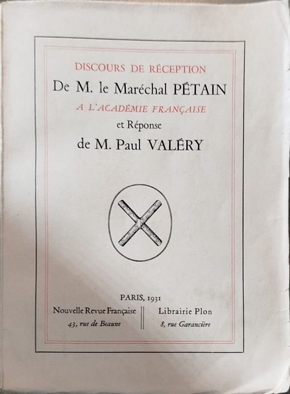 Librairie Plon 1931 136 pages in8. 1931. broché. première édition. 136 pages. Ce livre contient le discours de réception prononcé par le maréchal Philippe Pétain lors de son entrée à l'Académie Française en 1931 ainsi que la réponse officielle de l'écrivain et philosophe Paul Valéry. Il s'agit d'une édition originale publiée par les éditions Nrf/Plon à Paris décrivant un moment protocolaire où le "Héros de Verdun" est accueilli par l'institution littéraire