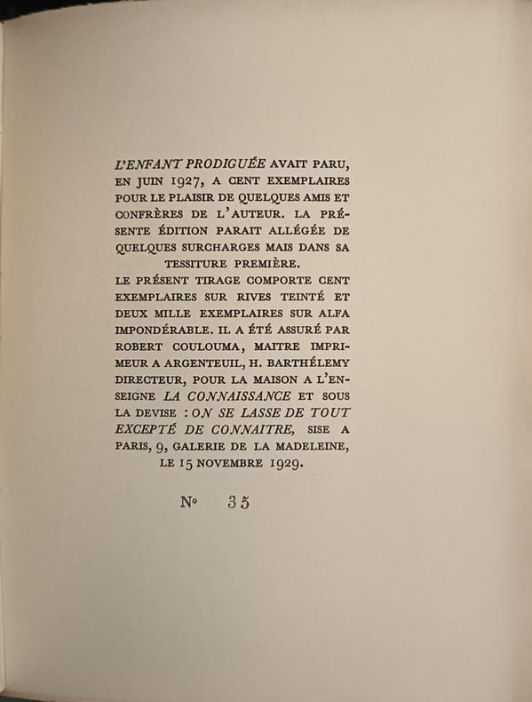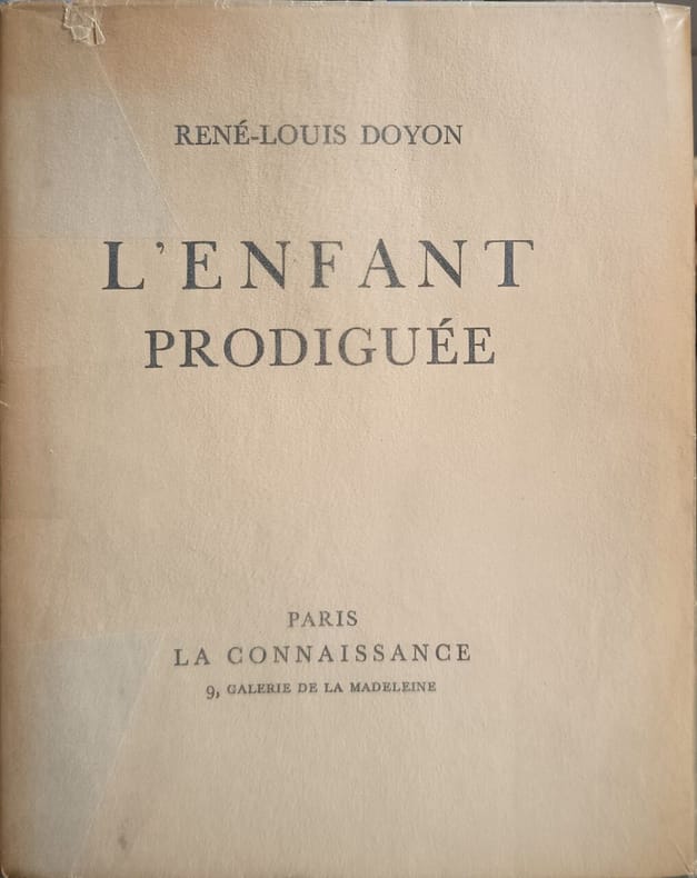 La Connaissance 1927 212 pages in8. 1927. broche sous papier cristal. 212 pages. L'Enfant prodiguée est un roman de René-Louis Doyon publié en 1929 par sa propre maison d'édition La Connaissance. L'histoire tourne autour d'une relation amoureuse où l'amant surnomme sa maîtresse « l'enfant prodiguée » dès le deuxième chapitre. Le livre est présenté comme un exemplaire numéroté sur papier de qualité caractéristique des éditions bibliophiliques de l'auteur