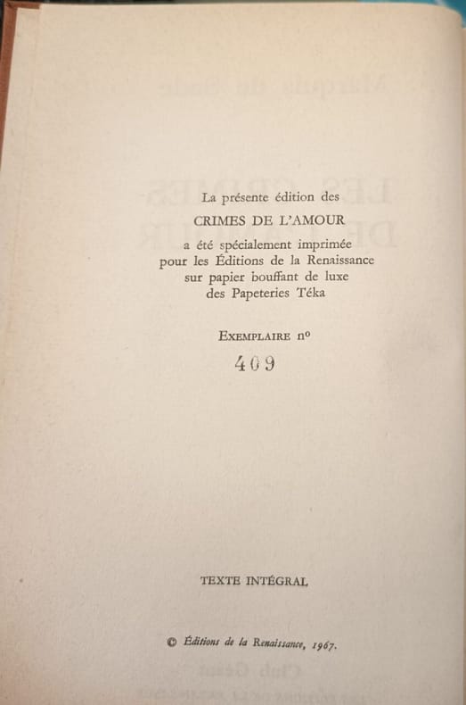 Éditions de la renaissance 1967 446 pages in8. 1967. reliure editeur. 446 pages. Recueil de onze nouvelles héroïques et tragiques du Marquis de Sade explorant les ravages des passions funestes comme l'inceste et la vengeance. L'œuvre de tonalité sombre et gothique utilise la peinture du crime pour éveiller terreur et pitié et s'inscrit dans une réflexion subversive sur la vertu la nature humaine et l'ordre social du XVIIIe siècle