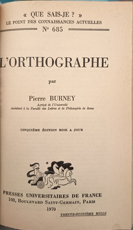 Presses Universitaires de France 1970 126 pages in8. 1970. reliure editeur demi basane à coins dos à nerfs. 126 pages. Cet ouvrage de Pierre Burney publié dans la collection "Que sais-je ?" des Presses Universitaires de France retrace l'histoire et l'évolution de l'orthographe française. Il propose une analyse critique des principaux projets de simplification orthographique et examine l'état officiel de l'orthographe au milieu du XXe siècle