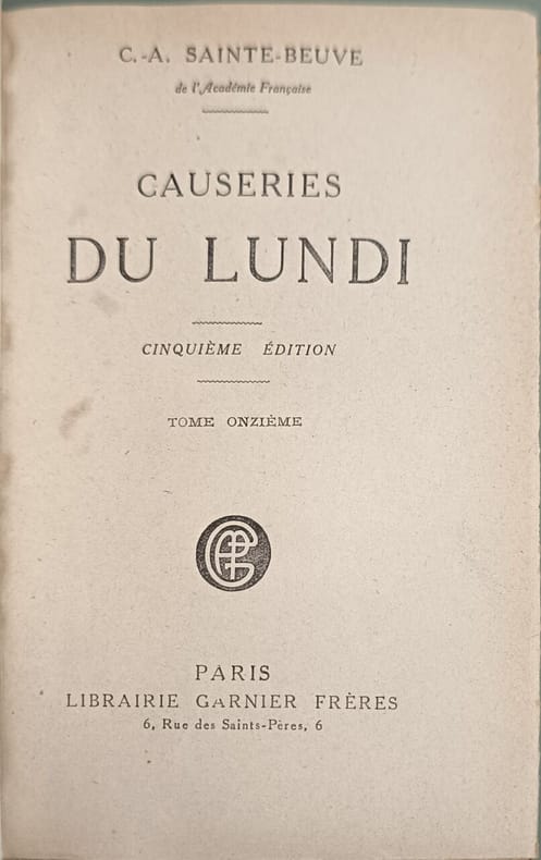 Librairie Garnier Frères 1854 535 pages in8. 1854. demi marocain dos à nerfs plats marbrés. 535 pages. Les Causeries du lundi sont un recueil d'articles de critique littéraire publiés par Charles-Augustin Sainte-Beuve entre 1851 et 1862 rassemblant des textes parus principalement dans le journal Le Constitutionnel. Cette œuvre en quinze volumes témoigne de l'engagement de l'auteur dans le journalisme littéraire et présente des portraits d'écrivains français