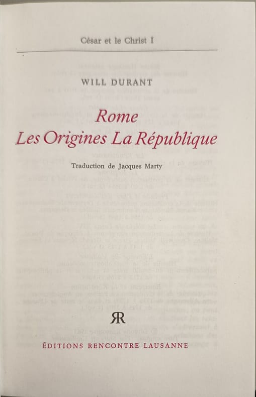 ÉDITIONS RENCONTRE LAUSANNE 1963 391 pages in12. 1963. reliure éditeur. 391 pages. Le livre "Rome origines" fait partie de l'œuvre colossale "Histoire de la Civilisation" de Will Durant (et plus tard de sa femme Ariel) une série de 10 tomes (32 volumes) couvrant l'histoire des civilisations depuis les origines. Ce volume spécifique traite des origines de Rome s'inscrivant dans le tome "César et le Christ" qui examine la civilisation romaine. L'œuvre est une étude historique approfondie et structurée publiée par les éditions Rencontre à Lausanne