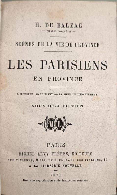 Michel Lévy Frères Éditeurs 1870 308 pages in12. 1870. demi basane. 308 pages. Les Parisiens en province est une nouvelle d'Honoré de Balzac publiée en 1833 faisant partie des Scènes de la vie de province de La Comédie humaine. L'œuvre propose une satire sociale mordante et une analyse subtile des personnages et de leurs motivations explorant les dynamiques entre Parisiens et provinciaux