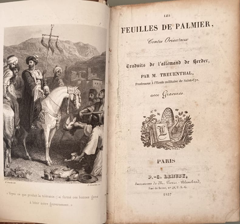 Herder J.G. Liebeskind Les feuilles de Palmier contes orientaux. In Russian (ask us if in doubt)/Herder J.G. Liebeskind Les feuilles de Palmier contes orientaux. (Palmovye listya: vostochnye skazki dlya molodezhi oboikh polov). Translated from German by M. Trienthal. Paris. Librairie de Lenfance et de la jeunesse P.-C. Lehuby. 1837. 290 pp. We have thousands of titles and often several copies of each title may be available. Please feel free to contact us for a detailed description of the copies available. SKUalbe974dc87fd883834