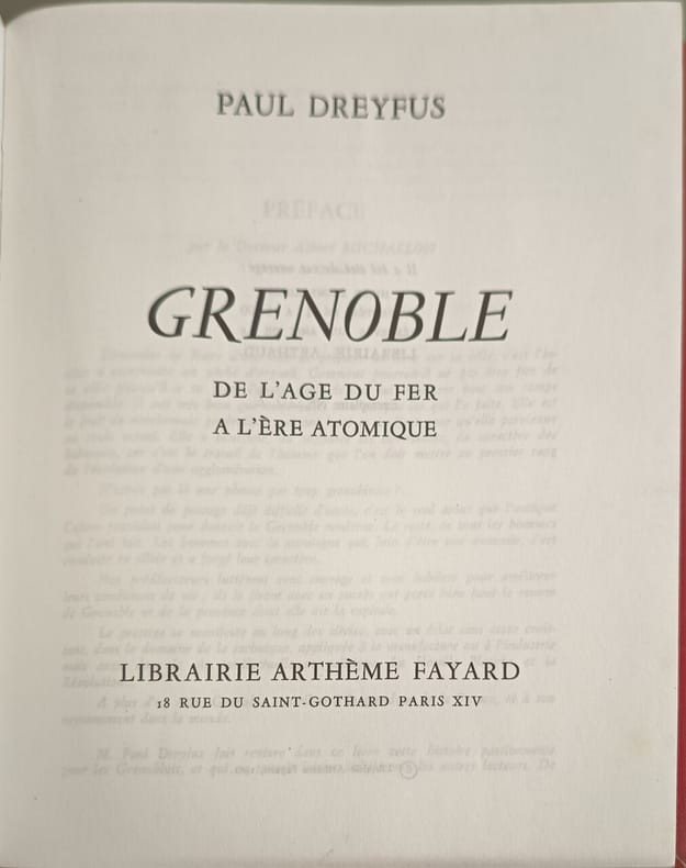 Librairie Arthème Fayard 1961 223 pages in8. 1961. pleine toile editeur sous rhodoid. 223 pages. Ouvrage historique de Paul Dreyfus retraçant l'évolution de la ville de Grenoble depuis l'âge du fer jusqu'à l'ère atomique. Publié en 1961 aux éditions Arthème Fayard il s'agit d'une monographie de 223 pages sur l'histoire de la ville et de sa région
