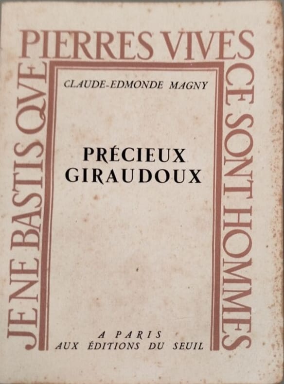 ÉDITIONS DU SEUIL 1945 120 pages in8. 1945. broché. première édition. 120 pages. Précieux Giraudoux est un essai critique de Claude-Edmonde Magny consacré à l'œuvre de l'écrivain Jean Giraudoux. Publié initialement en 1945 l'ouvrage propose une analyse littéraire approfondie s'inscrivant dans la collection 'Pierres vives' des éditions du Seuil. L'auteure philosophe et critique spécialiste du roman américain y examine la place et la valeur de Giraudoux dans le contexte littéraire de son époque