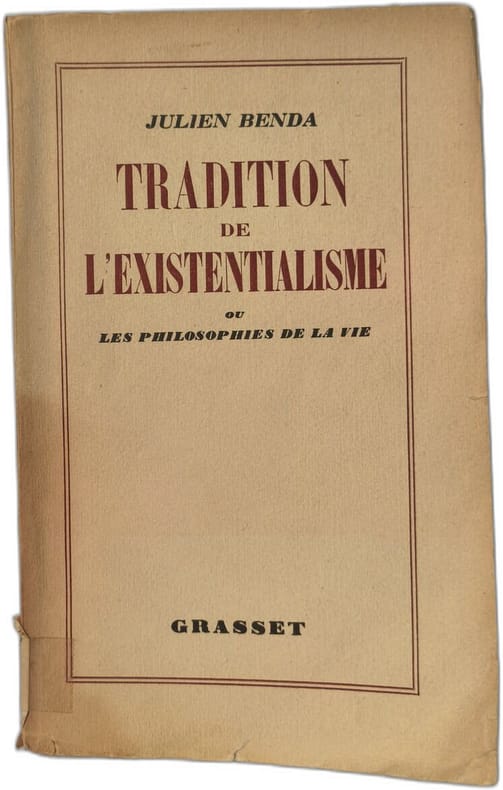 Critique de l'existentialisme, cette "forme moderne d'une position métaphysique très ancienne", par Julien BENDA (1867-1956). 1ère édition (après 42 exemplaires sur alfa) ?: mentions de 1er tirage à l'achevé d'imprimer (du 18 juin 1947) et de 7è édition (mention fictive ?) au 2nd plat.