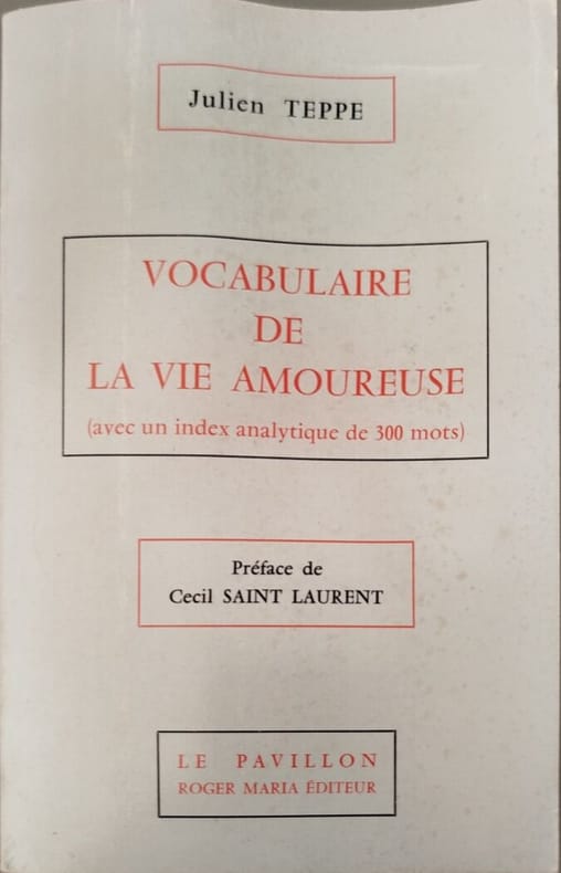 Roger Maria 1973 222 pages in8. 1973. broché. 222 pages. Le 'Vocabulaire de la vie amoureuse' est un recueil des chroniques que Julien Teppe a publiées sous le titre 'La grammaire galante' depuis 1953 dans la revue 'La Vie Parisienne'. L'ouvrage rassemble ces textes étoffés et mis à jour avec un index analytique de 300 mots. L'auteur y est présenté comme un amateur gourmand de la langue française évitant les analyses structuralistes