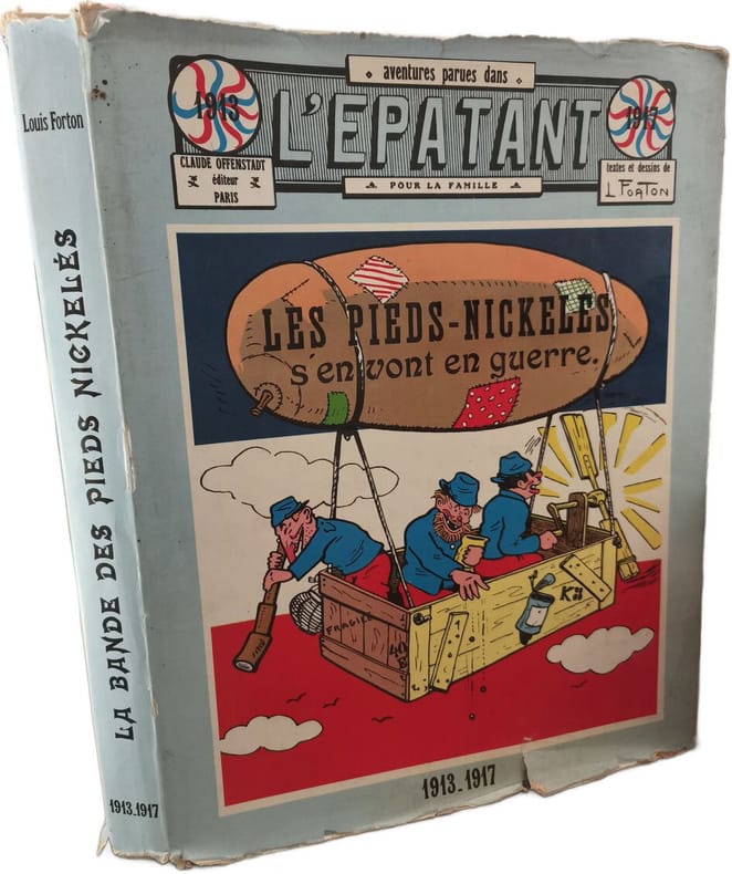Claude Offenstadt 1966 301 pages IN4. 1966. Reliure Editeur avec jaquette. 301 pages. Cette bande dessinée de Louis Forton publiée en 1915 dans le journal L'Épatant suit les aventures des trois héros Croquignol Ribouldingue et Filochard qui gagnés par la fièvre patriotique au début de la Première Guerre mondiale décident de mettre leur ingéniosité au service de la Nation. Le trio inflige une guerre d'usure humoristique aux soldats allemands (les 'Boches' ou 'casques-à-pointe') en utilisant des moyens décalés comme des boules puantes et des dirigeables de fortune
