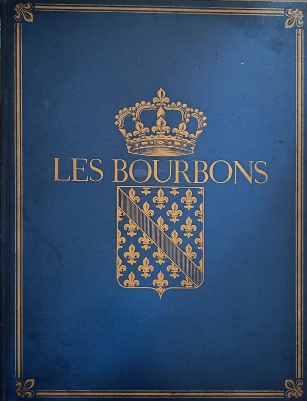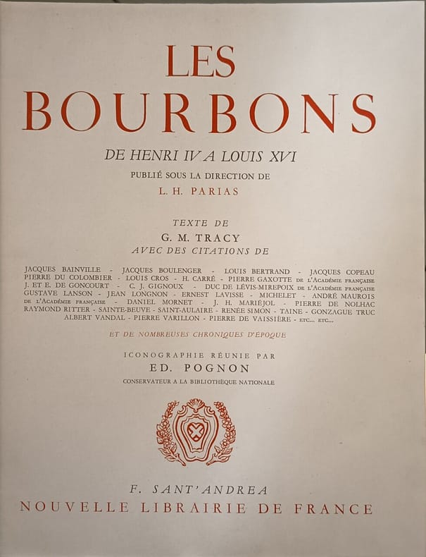 P., F. Sant'Andrea, Nouvelle Librairie de France, 1953, in-4°, 398-(16) pp, très nombreuses illustrations et portraits dans le texte et sur 25 planches hors texte (dont 17 en couleurs), plans, cartes, fac-similés, armoiries, tableaux généalogiques, tables), reliure simili-vélin de l'éditeur, titre et blason des Bourbons dorés au 1er plat, bon état