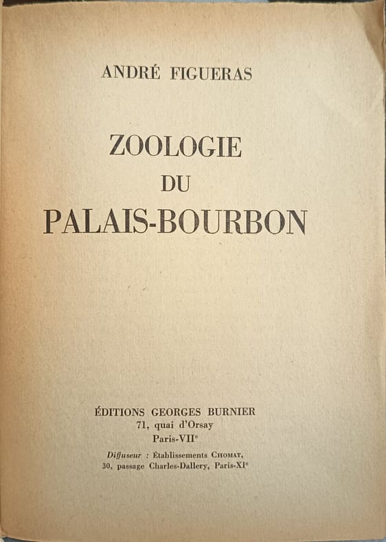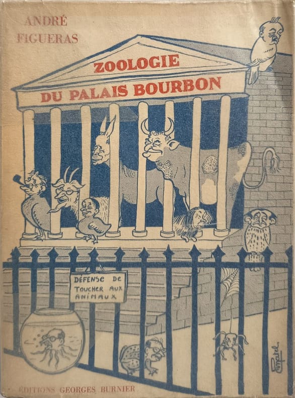 Éditions Georges Burnier 1956 187 pages in8. 1956. broché. 187 pages. Ouvrage satirique d'André Figueras publié en 1956 (avec une édition augmentée en 1964) qui propose une caricature zoologique des hommes politiques de l'Assemblée nationale française après 1945 utilisant l'analogie animale pour critiquer le personnel politique