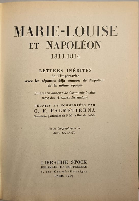 Librairie Stock 2026 312 pages in8. 2026. reliure editeur pleine toile. 312 pages. Cet ouvrage présente une correspondance inédite entre l'impératrice Marie-Louise et Napoléon Bonaparte durant les années 1813-1814 période cruciale de la fin du Premier Empire. Les lettres de l'impératrice sont accompagnées des réponses déjà connues de Napoléon complétées par des documents inédits provenant des archives Bernadotte. L'ensemble est réuni commenté par l'historien Carl Frédéric Palmstierna et enrichi de notes biographiques par Jean Savant