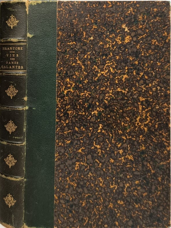 Ensemble complet de ses deux volumes ; sous agréables reliures du temps. ''Peu d’écrivains, sans doute, ont aimé les femmes autant que Brantôme, ci-devant abbé commendataire. Ces femmes..., leur chair blanche, leur bouche, leurs jambes... Aucune limite n’est pour lui concevable au déduit. Il semble qu’il ne peu pas s’arrêter de parler de l’amour, de l’amour physique; il en fait d’ailleurs la démonstration à la fin de maints paragraphes en s’exclamant qu’il en a assez dit, qu’il lui faut s’arrêter, que trop, c’est trop; mais il ne le peut et il en rajoute: encore une histoire de lit, encore une anecdote grivoise ! Pour lui, l’amour et le désir commandent tout: Il n’y a de loi qu’un beau cul ne renverse !'' Graesse I, Trésor de livres rares et précieux, p. 524 - Brunet I, Manuel du libraire et de l'amateur de livres, 1212 (pour une édition de 1838). Légers frottements affectant le papier marbré des plats. Quelques rousseurs dans le texte. Du reste, bonne condition.