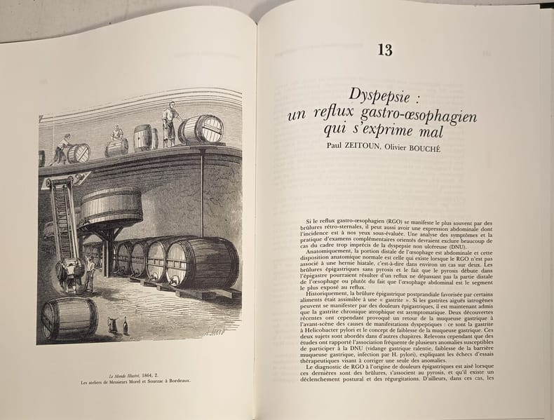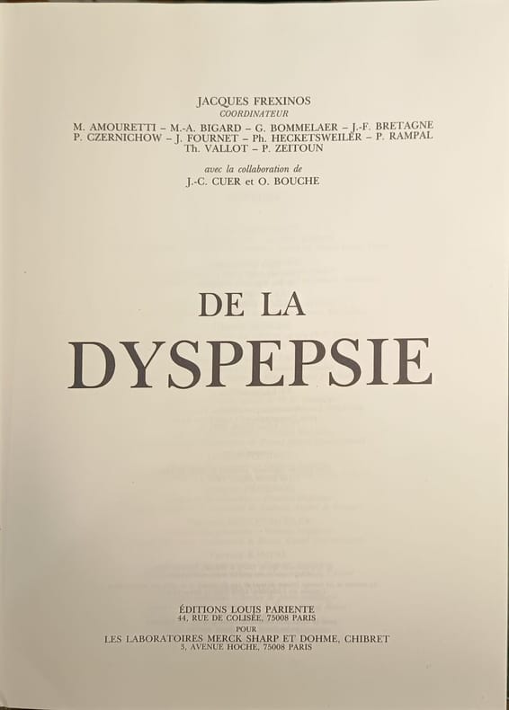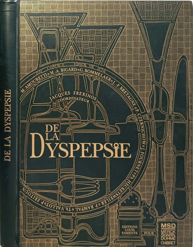 1992 1992. luxueux volume en grand format cartonné 185 pages aux éditions Louis Pariente pour les laboratoires MSD ( Merck Sharp Dohme) ; édition originale 1992. ouvrage collectif co-écrit par d'éminents professeurs sous la collaboration de Jacques Frexinos). avec une superbe iconographie en noir et blanc ( photos gravures dessins) qui font de cet ouvrage sur la dyspepsie un véritable ouvrage de collection. en TRES BON ETAT ; complet et solide pas annoté sans déchirures ; intérieur quasi neuf propre et frais