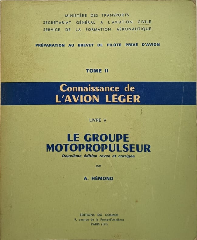 ÉDITIONS DU COSMOS 1970 109 pages in8. 1970. reliure editeur. 109 pages. Ce livre est le volume 5 de la série 'Connaissance de l'avion léger' consacré spécifiquement au groupe motopropulseur des avions légers. Il s'agit d'un manuel technique illustré destiné à la préparation au brevet de pilote privé d'avion publié par les Éditions du Cosmos en 1970