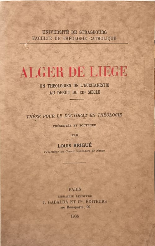 J. Gabalda et Cie Editeurs 1936 190 pages in8. 1936. broché. 190 pages. Cette thèse de doctorat en théologie de Louis Brigué publiée en 1936 étudie la vie et l'œuvre d'Alger de Liège un prêtre bénédictin et canoniste du début du XIIe siècle. L'ouvrage se concentre particulièrement sur sa contribution à la théologie eucharistique de son époque en replaçant sa pensée dans son contexte doctrinal