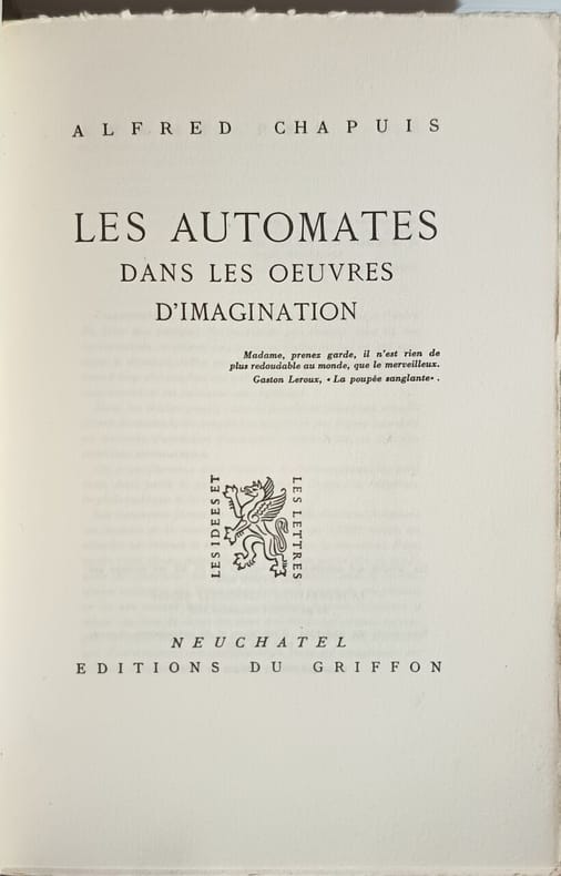 ÉDITIONS DU GRIFFON 1947 269 pages in8. 1947. broché. 269 pages. Ouvrage d'Alfred Chapuis publié en 1947 qui explore la représentation des automates dans la littérature d'imagination. L'auteur y examine comment les civilisations ont été fascinées par la vie artificielle et place l'automatisme comme thème plus actuel que jamais à son époque