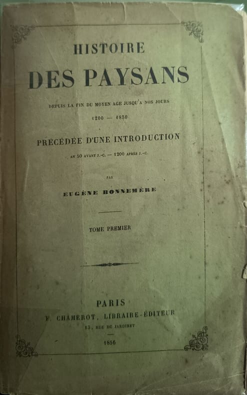 V. Chamerot Libraire-Éditeur 1856 543 pages in8. 1856. broché. 543 pages. Ouvrage historique d'Eugène Bonnemère retraçant l'histoire des paysans en France depuis la fin du Moyen Âge jusqu'en 1850 avec une introduction couvrant la période de 50 avant J.-C. à 1200 après J.-C. L'œuvre se présente en deux volumes et constitue une étude approfondie de la condition paysanne sur une longue période