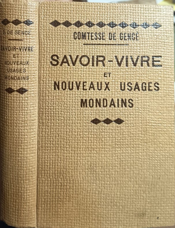 Albin Michel 1935 438 pages in8. 1935. reliure editeur. 438 pages. Ouvrage de savoir-vivre publié en 1935 par la Comtesse de Gencé offrant des conseils sur les usages mondains en famille (rapports familiaux maîtres-serviteurs fêtes naissances mariages décès) et en société (rencontres visites repas bals soirées)