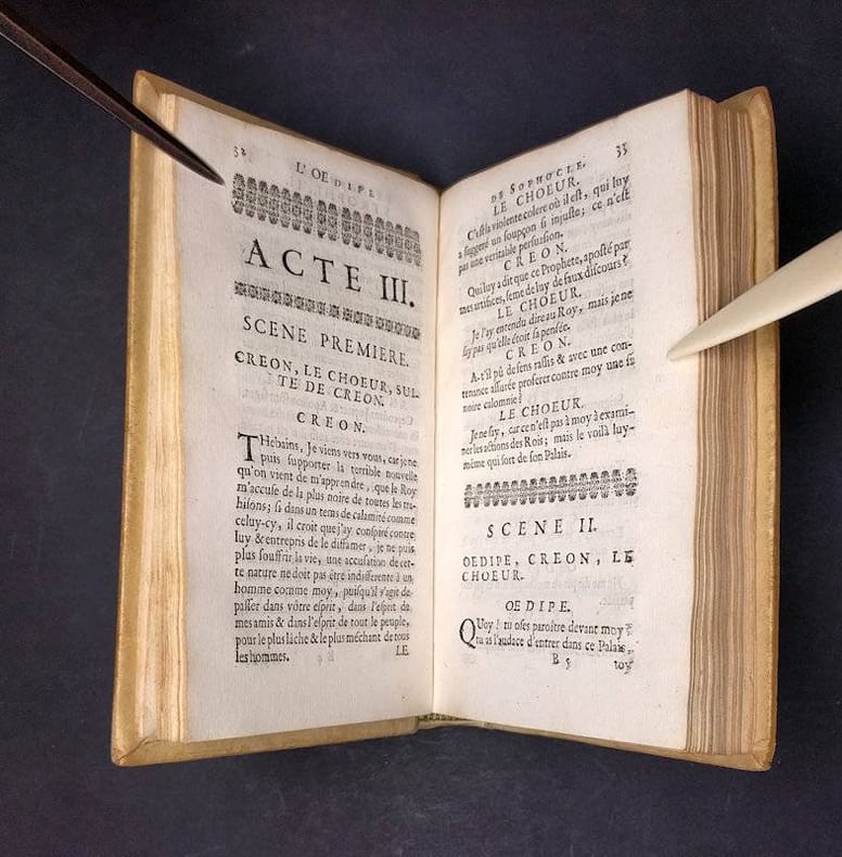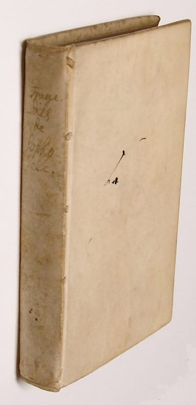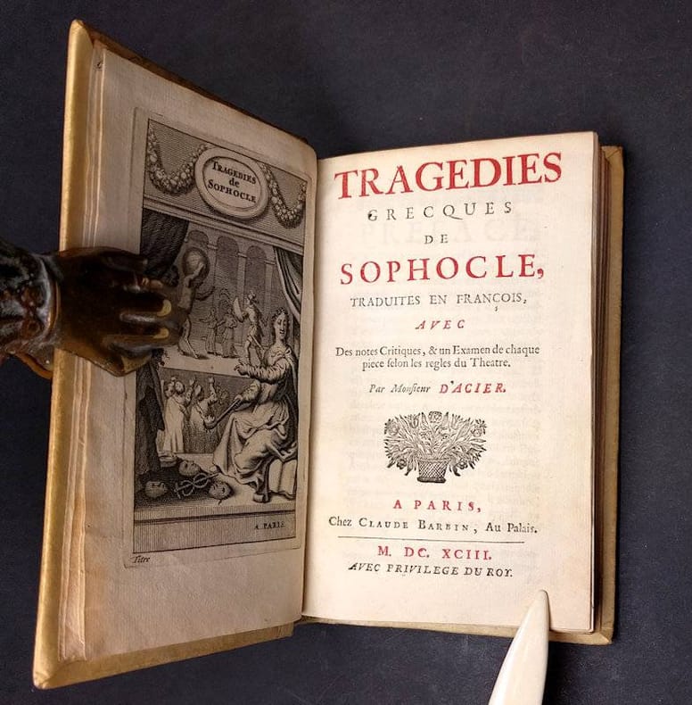 Small 8vo. Frontispiece, (X),324 p. Vellum 16.5 cm (Ref: Hoffmann 3,428; Schweiger 1,298; Moss 2,609; Ebert 21521; Graesse 6/1,447; cf. Neue Pauly Suppl. 2, p. 554 for the edition of 1692) (Details: 5 thongs laced through the joints.The frontispiece depicts the tragic poet, in the background a scene on a stage. Title in red and black. Prose translation of the Oedipus Rex and the Electra. At the end of each play ca. 60 pages filled with 'remarques') (Condition: Small inkstain on the frontcover) (Note: The French scholar André Dacier, 1651-1722, was the first Frenchman to translate a Greek tragedy in 120 years! The latest translated tragedy dates from 1573, an 'Antigone' translation of J.-A. de Baif. During this period the Roman author Seneca was the only tragedian in the spotlight. At the end of the 17th century arose a new demand among men of letters for new translations of almost forgotten classical playwrights. The Parisian publisher Barbin brought in 1692 a French translation of the Poetics of Aristotle by André Dacier on the market, an obscure and difficult treatise on the Art of Poetry, the first philosophical treatise that focuses on literary theory, especially of tragedy, and that has exerted a tremendous and lasting influence on western literature. In the same year Barbin and Dacier published a French translation of two plays of Sophocles, the Oedipus Rex and the Electra, as a kind of companion volume to this Poetics translation. This Dacier makes clear right at the beginning of the preface: 'Aprés avoir expliqué la Poëtique d'Aristote, j'ai cru qu'il 'etoit necessaire de donner une traduction de quelques Tragedies des Grecs, afin qu'on pût voir en même tems la régle & l'exemple'. (leaf *2 recto)' The Oedipus Rex and the Electra are perfect works of art (rien de plus parfait) for the understanding of Aristotle's treatise. The translation of Sophocles's plays was published anonymously as: 'L'Oedipe et l'Electre de Sophocle. Tragédies Grecques. Traduites en Francžois avec des remarques'. Our edition of 1693 is a reissue of this edition, with a slightly different title, now with the name of the translator, but remarkably enough omitting the names of the two plays presented. Most reference works only mention the 1692 edition) (Collation: pi1 (frontispiece), *6 (minus leaf *6); A-N12, O6) (Photographs on request)
