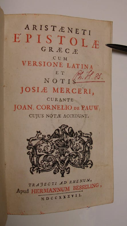 4to. (XXIV),287,(1 colophon) p. Overlapping vellum 15.5 cm (Ref: Hoffmann 1,240; Schweiger 1,44; Dibdin 1,292; Fabricius, Bibliotheca Graeca, ed. 4a, Hamburg 1780, p. 696; Brunet 1,448; Ebert 1066; Graesse 1,204) (Details: 5 thongs laced through the joints. Title printed in red and black. Woodcut ornament on the title. Greek text with facing Latin translation, commentary on the lower half of the page. Edges dyed blue) (Condition: Vellum slightly soiled. Stamp and name on the front flyleaf. Small part of the right lower corner of the front flyleaf cut off, and renewed. Small shelf number in red ink on the title. Two stamps on the verso of the title) (Note: A survey of erotic motives in the literature of Greece and Rome. Aristaenetus is the established name of the author of a collection of love letters in two books, probably from the beginning of the 6th century AD. It survives only in one Codex, of which the first folio with the name of the real author is lacking. Aristaenetus (Bestpraiseworthy) is only applied to the sender of the first letter. This is clearly a case of an imaginary letter-writer. The sources used are Plato, Menander, Lucianus, Alciphron, Philostratus , the ancient novels, and love elegies of Callimachus. Aristaenetus draws however in a conventional way a veil over too explicit love-making. The collection is a kind of survey of erotic motives in the literature of Greece and Rome. Everyting erotic however is covered with a veil of prudery. Aristaenetus ends after some cuddling before the bedroom is entered. (Neue Pauly, 1,1087) The collection was allready attributed to Aristaenetus in the 'editio princeps' of Antwerp 1566, edited by J. Sambucus. An edition with a Latin translation was published in 1595 in Paris by Iosias Mercier, the 4th edition of which dates from 1639. Mercier was the first to observe that the first letter of the collection was imagined to have been written by one Aristaenetus, and that the collection belonged to the genre of imaginative epistolography. Aristaenetus had to wait almost a century for the next edition, which appeared in 1736 in Utrecht, produced by Jacobus van Lanckom. Exactly the same edition was brought on the market by the Utrecht publisher Hermannus Besseling, only the impressum on the title differs, the rest is exactly the same. It was said that Aristaenetus was put to sleep in the commentary of Pauw. A revised edition was published in Zwolle in 1749. Cornelis de Pauw, born ca. 1680 in Utrecht, was canon of the 'Sint Jan'. He was a classical scholar of some repute, and published several editions of Greek and Roman authors, Hephaestion, Horapollo, Anacreon, Quintus Smyrnaeus, Theophrastus's Characters, Phrynichus, Aeschylus. By some detractors he was considered to be an 'homme médiocrement savant', whose ignorance was only exceeded by his impudence. He died in 1749) (Provenance: On the front flyleaf a stamp: 'Prof.Dr. Joh. Irmscher, Berlin NO 55, Erich-Weinert-Strasse 126'. Johannes Irmscher, born in Dresden 1920, was a classical philologist and byzantine scholar, who made his carreer in the DDR. He died in 2000. On the same flyleaf also in ink: 'C. Schoenemannus, Isleb. 1782'. This book once belonged to the German classical scholar and geographer Karl Traugott Gottlob Schoenemann, born in Eisleben in 1765. He studied classical philology and ancient geography in Göttingen. In 1787 and 1788 he published the treatises 'De geographia Homeri' and 'De geographia Argonautarum' . He died prematurely in 1802. Posterity is still thankful for his 'Bibliotheca historico-litteraria patrum latinorum a Tertulliano usque ad Gregorium M. et Isidorum Hispalensem' (1792/94), a still indespensable work of reference for early Christian Latin literature, from Tertullian to Isidor of Sevilla. On the title in red ink: 'Ph.H. 85'. On the verso of the title a round stamp of: 'Biblioth. Gymn. Ill. Gothana'. This stamps dates from before 1859. In that year the local 'Gymnasium Illustre' and the 'Herzogliches Realgymnasium' were transformed into the 'Gymnasium Ernestinum Gotha'. (See Wikipedia 'Ernestinum Gotha') (Collation: *8, 2*4, A-S4) (Photographs on request)