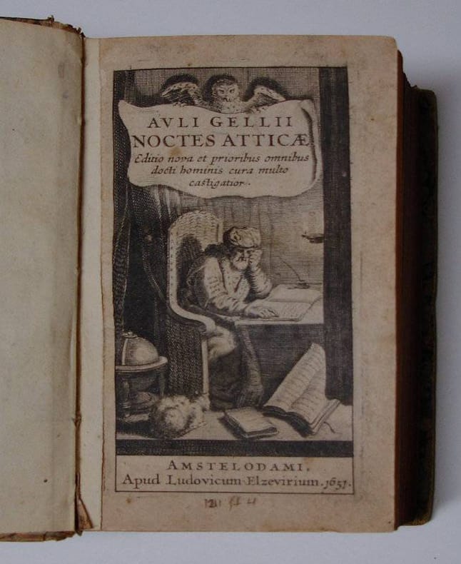 12mo. (XLVIII),498,(122 index) p. 19th cent. marbled boards. 13 cm (Ref: Neue Pauly, Suppl. 2, p. 261; Willems 1127: 'Édition fort jolie et qui passe pour très correcte'; Berghman 2065 ; Rahir 1145; Graesse 3,46; Ebert 8287; Dibdin 1,340/41; Fabricius/Ernesti 3,10: 'emendatissima editio'; Schweiger 2,378: 'Neue, werthvolle Recens. nach Handschr. von Jo.Frd. Gronovius'; Brunet 2,1524: 'Jolie édition') (Details: 5 thongs laced through the joints; engraved title, depicting a learned writer at work under the light of an oil lamp) (Condition: Cover worn at the extremities; marbled paper on the back scuffed; lower corner of a few leaves vaguely waterstained; without the last two blank leaves. Paper somewhat yellowing) (Note: A favorite author of the Renaissance. The Latin author Aulus Gellius, ca. 125-180 AD, was never counted as a major author in antiquity, nor later. His only work 'Noctes Atticae' or 'Attic Nights', is a miscellany that 'ranges from literature to law, from wondrous tales to moral philosophy; one of his favorite topics is the Latin language'. (...) The exposition, in a mildly archaizing but never difficult Latin, often takes the form of dialogues with or between culturally eminent persons whom Gellius had known'. It derives its name from the fact of its having been written during the long nights of a winter which the author spent in Attica as a young itinerant student. The Noctes Atticae were exploited by pagans and Christians alike in late antiquity. In medieval florilegia he is much quoted for piquant tales and moral sentiments. 'From Petrarch onward Gellius became a favorite author of the Renaissance'. 'More than 100 manuscripts were copied'. He was used as a valuable source of information on the Latin language, and had preserved numerous quotations from lost authors, which were presented with grace and elegance. Gellius became a model for the 'Miscellanea' of the Italian humanist Angelo Poliziano. 'In the 18th century, however, new canons of elegance caused his style to seem less attractive, and compilation sank to minor merit' (Quotations from 'The Classical Tradition', Cambr. Mass., 2010, p. 386/7) The 20 books of the Noctes Atticae were ably edited 'cura docti hominis'. This learned editor was the Dutch classicist of German origin Johann Friedrich Gronov, or Gronovius, 1611-1671, He was the successor of Heinsius at the University of Leiden, and he was influenced by Vossius, Grotius, Heinsius & Scriverius. His editions mark an epoch in the study of Livy, of Seneca, Tacitus & Gellius. (Sandys, History of Classical Scholarship, 2,321) (Provenance: On the front pastedown in ink the name of 'Berend van Marle' or 'Barend van Marle', and in pencil the name of a collector of Elzeviers 'J. van Dijck') (Collation: * - 2*-12; A - 2C-12 (lacking the blanks 2C11 & 2C12) (Photographs on request)