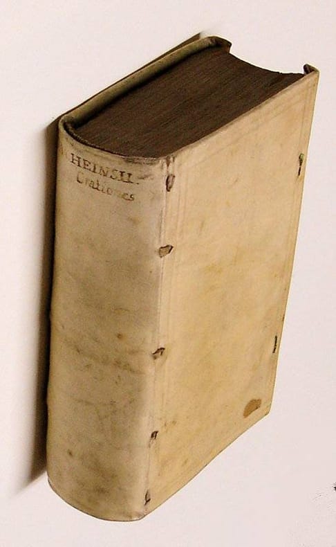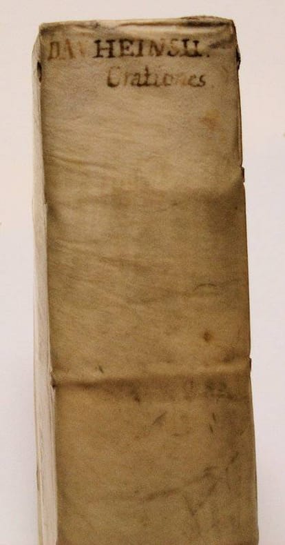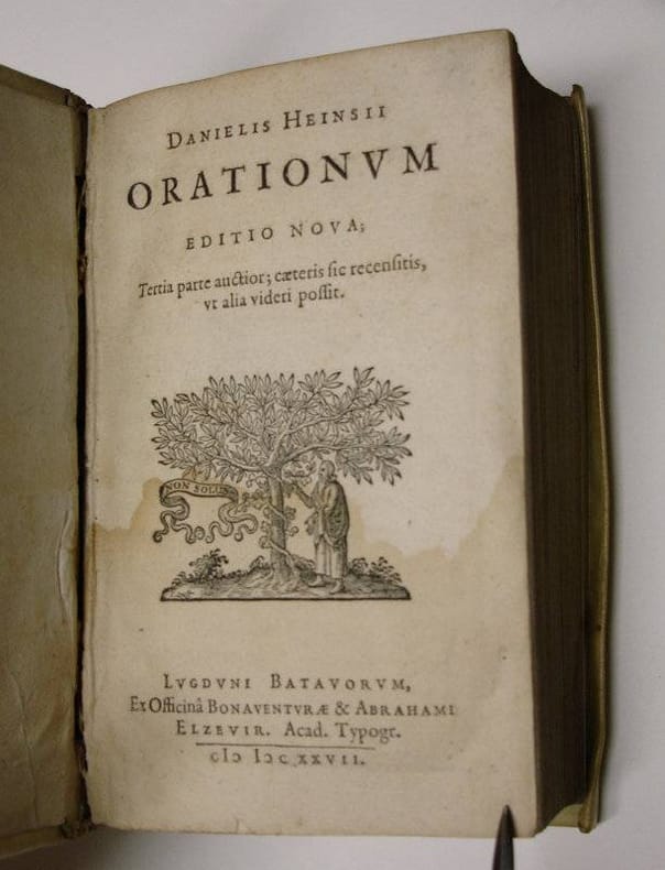 8vo. (XVI),661,(3) p. Overlapping vellum 15.5 cm Oratorical fireworks (Ref: Willems 277; Berghman 770; Rahir 239 or 240) (Details: 5 thongs laced through the joints. Boards with blind double fillet borders. Elsevier's woodcut printer's mark on the title of both volumes, depicting an old man standing in the shade of a vine-entwined elmtree, symbolising the symbiotic relationship between scholar and publisher. The motto is: 'Non solus', probably indicating the interdependency of publisher and scholar. They cannot do it alone, and need each other) (Condition: Vellum age-tanned. Waterstained in the lower margin at the beginning and at the end of the book. All 4 ties gone. Paper yellowing, some faint browning. Old ownership entry on the front pastedown) (Note: The Dutch classical scholar of Flemish origin Daniel Heinsius, 1580-1655, who enjoyed an international reputation as an editor of classical texts, theorist of literary criticism, historian and neolatin poet, was professor of Poetics at the University of Leiden since 1603, extraordinarius Greek since 1605. After the death of J.J. Scaliger, to whose inner circle he belonged, he held the chair of Greek, from 1609 till 1647. His activities have been obscured to later generations by the very bulk and variety of his activities. He is still remembered for his neolatin poetry, and for his edition of Aristotle's treatise on poetry (1611), which he studied in connexion with the 'Ars Poetica' of Horace. This edition is 'the only considerable contribution to the criticism and eludication of the work that was ever produced in the Netherlands. (...) In his pamphlet 'De tragoediae Constitutione', published in the same year (1611), he deals with all the essential points in Aristotle's treatise, giving proof that he has thoroughly imbibed the author's spirit'. (J.E. Sandys, 'A history of classical scholarship, N.Y., 1964, vol. 2, p. 314) Heinsius was an inspiring teacher and a talented speaker. 'His courses in the University were so impressive that his colleagues attended his lectures, (...). As an ornament in which the University took especial pride, his eloquence graced many public functions. Heinsius composed not only the funeral orations for Philip Cluverius, and for Reinerus Bontius, Professor of Medicin, in 1623, but delivered on 19 September 1625 a 'stupenda oratio', on the death of Prince Maurice, for which he received an award of 200 guilders'. (Sellin, P.R., 'Daniel Heinsius and Stuart England', Leiden etc., 1968, p. 36) The first edition of collected orations, 12 of them, was published in 1612. The second augmented edition came in 1615. Demand for more orations arose, and 1620 saw another augmented edition, augmented further in 1627 (this edition). This edition naturally opens with this stupendous oration on the death of Prince Maurice, followed of course by that other oratorical firework, his funeral speech for his beloved master, the French scholar Joseph Justus Scaliger, a still glowing jewel of the University, who died in Leiden in 1609. At the end have been added 27 pages with letters and prefaces that Heinsius wrote for editions of others. Still more augmented editions of the 'Orationes' were published in 1642, 1652 and 1657) (Provenance: Winterthur provenance? On the front pastedown in faint ink: 'And. Bidermanni'. Googling for 'Andr? Bidermann', we found a Gymnasium teacher in Winterthur, born in 1776, appointed in 1819. There were several hits placing a Andr. Bidermann in the Canton Zürich, Winterthur. More indications in that direction, when we searched for 'Andreas Bidermann') (Collation: *8, A-2S8, 2T4; we couldnot find out whether our copy has the cancels of p. 277/8 and 419/20, which Willems mentions, or not) (Photographs on request)