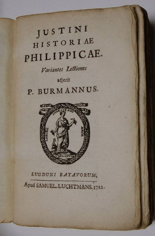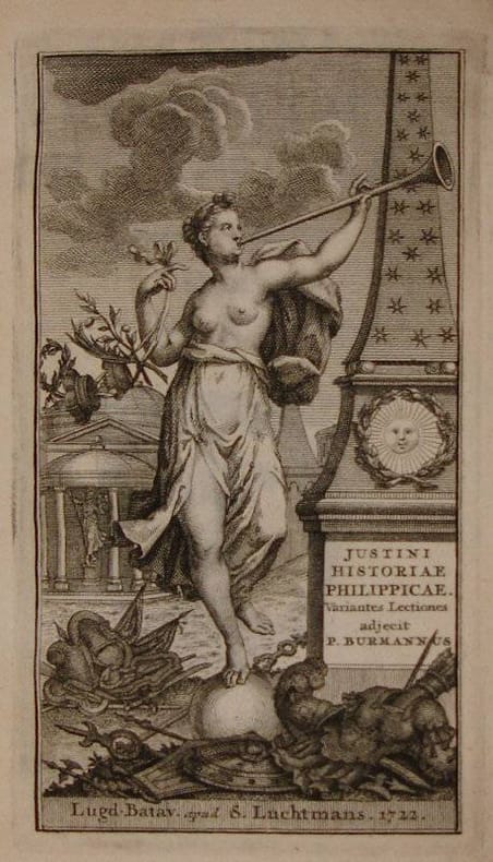 12mo. Frontispiece, (XXIV),443,(62 index),(1 blank) p. Contemporary stiff wrappers. 14 cm (Ref: Schweiger 2,492; Fabricius/Ernesti 3,66; Graesse 3,513; Ebert 11155) (Details: Margins uncut. Engraved frontispiece, depicting a half naked woman, who blows a trumpet that she holds in her left hand; in her right hands she holds a string to which are attached 2 crowns and a laurel wreath; she stands on a globe, amidst all kinds of spolia; right of her is a monument with celestial symbols, stars and a radiant sun. Is she a combination of Fama, Dea Roma, Juno Caelestis? On the title a woodcut printer's mark, that shows a standing woman within an oval wreath; she hold in her right hand a hammer, in her left a hook, a little flame burns on her head, at her feet is a crane, that holds a stone in one of its claws. The motto is: 'Deo duce ingenio arte vigilantia labore)(Condition: Paper on the back partly gone) (Note: This is an epitome made by one Justinus, probably in the third century A.D., of the 'Historiae Philippicae' of the Augustan historian of Gaulish descent Pompeius Trogus, who got his nomen because his grandfather was given Roman citizenship by the Roman military leader Pompeius Magnus after his campaign against Sertorius in Spain. Important parts of Trogus' 'Historiae Philippicae', which numbered 44 books, only survive in this epitome of Justin, who boiled it down, it is estimated, to 1/10th or 1/6th. (Neue Pauly 10, p. 115) Trogus produced a universal history of the peoples outside Italy. He seems to have used no other sources than Greek historians, and his story runs from Ninus king of Assyria to the absorbtion of the other nations into the Roman empire, and the establishment of the 'Pax Augusta'. Books 7/12 describe the rise of Philip II and of Macedonia. Books 13/40 treat the Hellenistic kingdoms. 41/42 contain the history of Parthia, 43 of Italy, and 44 the history of Spain. Inserted are many historical and geographical excursus, for example on the history of Armenia or the Jewish wars. The leading concept of Trogus' history was the so-called 'translatio imperii', which conceived history as a linear succession of empires under a singular ruler or emperor. The narrative is elaborate, dramatic and moralizing. Trogus was, according to Rose, an very passable stylist, who arranged his second hand material intelligently, and showed 'some original views how to write history. (...) Even in this diminished condition (the epitome) the history is interesting reading, often containing facts not to be met with elsewhere, and one of our much too scanty sources for the history of the eastern Mediterranean and the adjacent countries'. (H.J. Rose, 'A Handbook of Latin literature', 'London 1967, p. 312/13) The epitome of Justin was widely read in the Middle Ages. This Justinus edition was produced by the Dutch classical scholar Pieter Burman, or Petrus Burmannus, 1668-1741, from 1696 professor of Eloquence at Utrecht, and from 1715 at Leyden. As an editor he confined himself to the Latin classics. He produced editions of the Roman poets Ovid, Lucan, Claudian, and Valerius Flaccus. Of prose the writers he edited Petronius, Velleius Paterculus, Justin, Quintilian and Suetonius'. (J.E. Sandys, 'A history of classical scholarship', N.Y.1974, vol. 2, p. 445) Burman was not an original scholar, but more an industrious manufacturer of so-called 'Variorum' editions (from 'cum notis Variorum'), editions with a 'textus receptus' which was widely accepted, accompanied by an overload of often ill-digested commentaries, excerpts and annotations of various specialists and other leading scholars. This Justinus is an exception, it is mean and lean; it offers a text (borrowed from Graevius), without commentary, but with occasionally variant readings that were taken from earlier editions of Aldus, Giunta, Bongarsius, Graevius, Hearne et alii)(Collation: *12, A-X12) (Photographs on request)