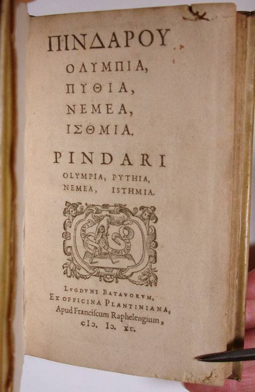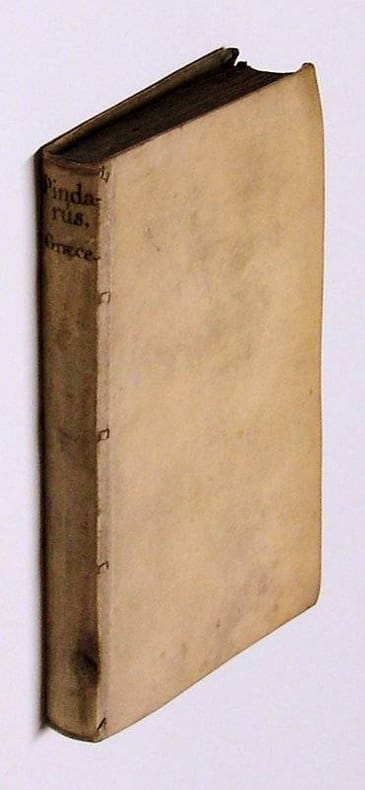 8vo. (XVI),246,(4 blank) p. Vellum. 16 cm (Ref: Hoffmann 3,98; Graesse 5,294; Ebert 16858) (Details: Woodcut printer's mark on the title, it depicts a hand that comes out of a cloud, and draws a circle with a pair of compasses, the motto is: 'Labore et constantia'. Short biography of Pindar by Gyraldus in Latin precedes the Greek text of the epinicia. Greek text only) (Condition: Vellum age-tanned. Some small wormholes in the blank upper corner of the first gathering, smaller pinpoint ones in next six gatherings, nowhere affecting the text. The edges of the lower corner of the first gathering eaten away by some insect) (Note: A quarter of the works of the Greek poet Pindar, ca. 518-438 BC, his four books of 'epinicia', named after the Great Games, the Olympian, Pythian, Nemean and Isthmian, survive. Pindar wrote eulogistic hymns to celebrate a victory in athletics, boxing and horse racing. Praised in a magnificent way are the victor, his family, the native city. 'Each ode draws from a variety of historical, cultural, and mythological sources. The highly allusive manner by which this material is presented is complemented by an equally rich repertoire of metrical patterns from epic, Doric, and Aeolic systems'. (The Classical tradition, Cambridge Mass., 2010, p. 729) 'Extended similes and difficult metaphors, intricate syntax and rapid narration, far-reaching digressions and bold disruptions' result in grandiose, but also obscure, enigmatic and sometimes seemingly awkward poetry. Already in antiquity the comic playwright Aristophanes presented in the 'Aves' Pindaric poetry as foolish, pretentious and embarrassing. The Hellenistic poets Callimachus and Theocritus wrote poetry under his influence. The Roman poet Horace thought him grandiose and sublime. Pindar's influence on European literature is great. The great number of editions in Greek, and Latin translations of Pindar's odes that were printed in the 16th century are an indication of a continuous and widespread humanist interest. Many of Pindar's gnomic maximes and punctuated statements, containing elements of traditional wisdom, were collected in Renaissance anthologies of 'sententiae', for example in Erasmus's Adagia. Already the first full Latin translation of Pindar (1528) indexed all the gnomes according to moral lessons. 'The sententious Pindar (...) provided the Humanists of the Reformation with pithy statements of moral instruction and wordly advice, which ensured the poet's place in pedagogical circles'. 'The sheer variety of Pindarically influenced traditions -the political ode and the personal, the religious hymn and the song of genius, the freely aimless and the rigorously concise- all serve as a testament not only to Pindar's versatility, but also to his rich potential to inspire'. (Op. cit. p. 730) For Filelfo, Pontano, Cowley, Dryden Pindar was a model for political encomium, and there are quite a number of imitators of Pindar in European literature. Giangiorgio Trissino wrote a tragedy and three canzoni in a form approximating Pindar's practice, Luigi Alamanni modelled his hymns on the Pindaric ode, Ronsard wanted to be the French Pindar, introducing the Pindaric ode into the vernacular literature of France. The French author Voltaire made the witty remark that Pindar wrote verses that no one understood, and everyone had to admire. For Thomas Gray, Goethe and Hölderlin he was a genius. This Pindar edition of 1590 is based, according to Hoffmann, Graesse & Ebert, on the Greek text of the edition of 1560 produced by the French scholar/printer Henri Estienne (Henricus Stephanus). Stephanus published a second (1566) and third edition (1586), all three containing in addition to the Greek text a Latin translation of the odes, but the 1560 edition is to be preferred, because the Greek text is, according to Dibdin the most correct. Plantin published a reissue of the Greek text of this 1560 edition earlier in 1567. Greek text only) (Provenance: On the front pastedown in pencil: '18 april 1961', written by the Flemish linguist Walter Couvreur, 1914-1996, who was an Orientalist, and professor of Indoeuropean linguistics at the University of Gent. It indicates the date of aquisition. The place of acquisition he wrote on the flyleaf at the end: 'Utrecht, Beijers, veiling Wille'. On the front flyleaf an illegible name, and 'J. Wille, 10 febr. 1928'. J. Wille, 1881-1964, was professor of Dutch literature and linguistics and at the same time librarian of the protestant Free University at Amsterdam. His specialty was 18th century Dutch literature, and an excessive buyer of books. His books were auctioned by Beijers at Utrecht on the 23rd, 26-27th april 1961. It was the largest private library ever auctioned by Beijers. (P.J. Buijsters, 'Geschiedenis van de Nederlandse bibliofilie, boek- en prentverzamelaars 1750-2010', Nijmegen, 2010, p.110/11; including a picture of Wille) (Collation: *8, A-P8, Q6 (leaves Q5 & Q6 blank) (Photographs on request)
