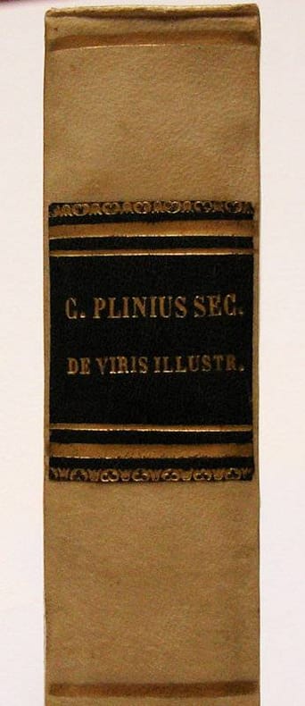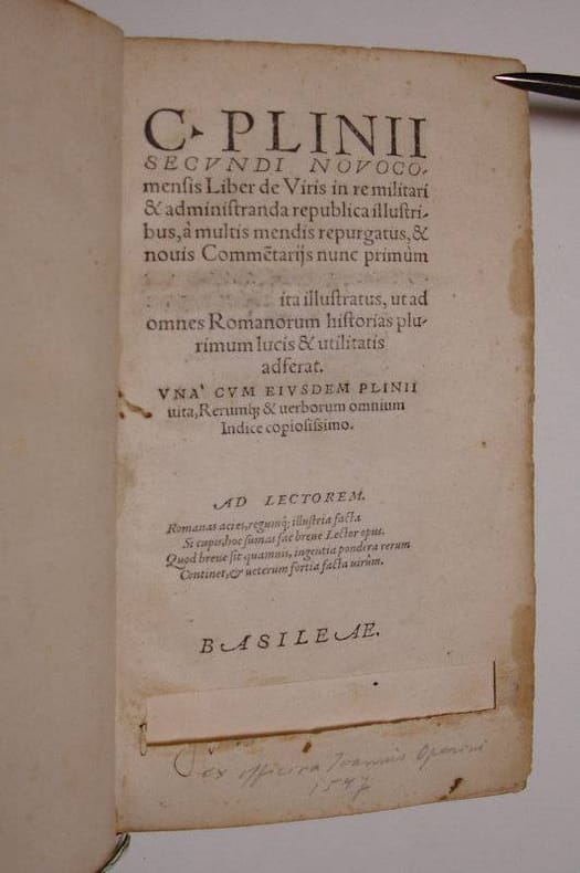 8vo. (XXXII),595,(75 index),(2 blank) p. 19th century half vellum 17 cm (Ref: VD16 P 3521; Schweiger, 2,1139 (under Sextus Aurelius Victor); Graesse 5,350) (Details: Back ruled gilt, and with a green morocco shield. 2 woodcut initials) (Condition: On the title page the words 'per Conradum Lycosthenem' are carefully erased. This erasing has been repeated on the verso of the title, where in the heading of the short biography of Pliny Minor the words 'a Conrado Lycosthene' have been erased. This erasure signals the attempt to eradicate the memory of the editor of this title, the Alsatian protestant humanist and encyclopedist Konrad Wolffhart, latinized as Conradus Lycosthenes, 1518-1561. In 1557 he published at Basel a work, 'Prodigiorum ac ostentorum chronicon', or ' Chronicle of omens and portents', with woodcuts of freaks, human monsters of all types, curious animals, comets, earthquakes etc. Two years later this title, and at the same time the entire oeuvre of Lycosthenes, was placed on the first catholic 'Index librorum prohibitorum' by Pope Paul IV. The 'Index' of forbidden books contained publications that were banned by the Catholic Church, because they were deemed heretical, anti-clerical or immoral. Often these books were censored or even destroyed. The censoring sometimes came down to the erasing or cutting out of names, or passages, or the removal of leaves, even complete chapters by catholic librarians. This explains the erasing of his name on the title page of this Plinius. The censor also cut out the name of the famous protestant publisher Oporinus, leaving a neat rectangular hole of 7.5x1 cm. The censor overlooked however the name 'Conradus Vuolfhardus' in the heading of the 'praefatio') (Note: 'The full maturation of ancient biography did not occur before the Roman late republican and imperial periods. The purposes of Graeco-Roman biography were varied, ranging from instructive praise of a subject's virtues, to panegyric, to providing insurance against the jaws of oblivion by immortalizing the 'fama' good or ill, of notable individuals'. (The Classical Tradition, Cambr. Mass., 2010, p. 127) In the early imperial period the Greek author Plutarch composed a series of vitae, which are discursive and generally show a strong moral bias. The Romans were in the writing of biography not wholly dependent on the Greeks. 'The attitudes and customs of their own political and family life led them to put a special value on recording the achievements of their great men'. (OCD 2nd ed. p. 168) Tacitus (Agricola), Nepos (Liber De Excellentibus Ducibus Gentium), Suetonius (Vitae XII imperatorum, or Caesares) are the principle Roman biographers. In late antiquity they found a number of imitators and continuators, e.g. the 'Scriptores Historiae Augustae' or 'Sextus Aurelius Victor'. This 'Liber de viris in re militari & administranda republica illustribus', nowadays called in the edition of Pilchmayr 'Incerti Auctoris liber de Viris Illustribus Urbis Romae', is one of those imiations. It contains more than 75 biographies of famous Romans from Romulus to Pompeius and Sulla. When it was written no one knows, some say first or second century AD, others the fourth. This collection of Lives of famous Romans, including Hannibal, his brother Hasdrubal, and king Mithridates, was long time primarily ascribed to Plinius Minor, 62-ca. 113 AD. The editio princeps was printed ca. 1470 and enjoyed a great popularity among humanists and on schools. Since the edition of Aldus in 1508 the collection is often called the 'Liber de viris in re militari & administranda republica illustribus'. Schweiger records before this 1547 edition ca. 40 editions, and there must be more. It was printed in the 16th century also under the name of Suetonius and of Nepos. Hyginus and Aemilius Probus are also mentioned as the authors. The Flemish scholar Andreas Schottus attibuted the text in 1577 to Sextus Aurelius Victor. From then on till the second half of the 19th century he was thought to be the author of this collection. (Schweiger 2, 1140/41) But nowadays the author is an anonymous, because the style (genus dicendi) does not suit Sextus Aurelius Victor. It is doubtful whether the author was a christian. He belonged probably to the Optimates. Though many historical errors hurt the eye of the reader, still this collection of biographies offers much that is of great help for our understanding of Roman history of the republican period. The collection figures anonymously in the 'Bibliotheca Teubneriana' edition of that writer of 1966 edited by Pilchmayr. Especially the praefatio of Pichlmayer offers much useful information (p. X & XI)) Conradus Lycosthenes lectured grammar and dialectics in Basel from 1542. In 1545 he was appointed deacon and preacher of the local 'St. Leonhardskirche'. He married Christine Herbster, a sister of Johannes Oporinus, the printer of this book. The biographer of Lycosthenes's short biography in ADB calls his commentary in this 1547 collection his most excellent work. (ADB 19, 727/28)) (Provenance: On the front pastedown in pencil: '24 dec. 1963', written by the Flemish linguist Walter Couvreur, 1914-1996, Orientalist and professor of Indoeuropean linguistics at the University of Gent. It indicates the date of aquisition. The place of acquisition is written on the flyleaf at the end: 'Bologna, Galliera') (Collation: alpha-beta8, a-2T8 (leaf 2T8 blank)) (Photographs on request)