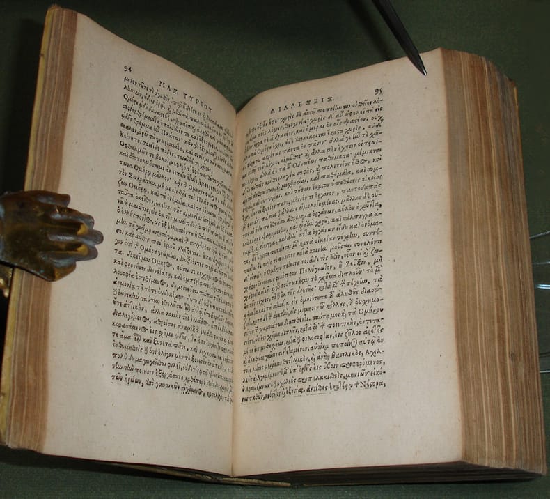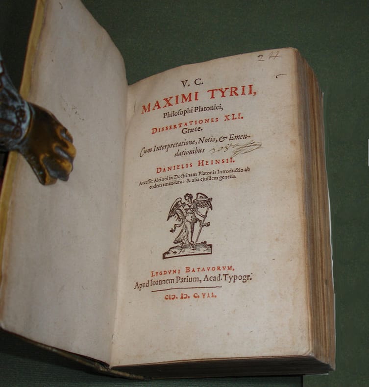 8vo. 3 parts in 1: (XXIII),(1 blank),408; (12),411,(4),(1 blank); (159 unnumbered pages),(1 blank) p. Vellum 17.5 cm (Ref: Hoffmann 2,585; Schweiger 1,204; Dibdin 2,232; Graesse 4,453; Ebert 13450; Brunet 3,1552) (Details: Greek texts and Latin translations. Each part has its own title, the first is in red & black. Woodcut printer's mark of Paets on the titles, depicting a winged young woman who holds a scythe in her left hand and an opened book in her right arm) (Condition: Vellum age-toned and spotted. Tiny hole in the vellum of the lower board. Both pastedowns detached. Bookplate pasted on inside of the upper board. First title finger soiled. Almost invisible pinpoint wormhole at the tip of the right upper corner of ca. 250 p. Paper yellowing) (Note: The Greek Platonist Maximus Tyrus, ca. 125-185 AD, was an itinerant philosopher, who left us 41 dissertations (dalexeis) on theological, ethical and philosophical subjects. These lectures are not great literature, nor specimina of great learning. Philosophical originality is not be be looked for in these lectures.The author offers a pleasant prensentation of a theme, and his lectures 'are simply eloquent exhortations to virtue decked out in quotations, chiefly from Plato, and Homer'. (OCD 2nd ed. 658) The themes are for example: 'die Lust (hêdonê, 29-33), sokratische Liebe (18-22), platonische Theologie (11), 'daimones' (8-9), Gebet (5), Weissagung und freier Wille (13), das Böse (41) und Wiedererinnerung (10)'. (Neue Pauly, 7,1074/75) Maximus Tyrius was widely read by humanists like Ficino, Bessarion and Poliziano. The 'editio princeps' was published in 1557 by the French scholar/publisher Henricus Stephanus. The next important and authorative edition was published in 1607 by the Dutch scholar Daniel Heinsius, 1580-1655, who was in 1607 librarian of the University of Leiden. In 1609 he succeeded as professor of Greek his praeceptor Josephus Justus Scaliger. The first 300 pages of the first part of this book contain the Greek text of the 'Dissertationes', followed by a number of Pythagorean fragments, and by 27 pages 'castigationes' on Maximus Tyrius by Henricus Stephanus. The pages 329-386 contain the Greek text of Alcinous' handbook of Platonism 'Introductio in Platonicam philosophiam'; the pages 387-408 contain Diogenes Laertius on Plato. The second part contains Heinsius's Latin translation of Maximus Tyrius and Alcinous; added are 33 pages with a Latin translation of the earlier mentioned Pythagorean fragments, made by the Dutch scholar Willem Canter. At the end 27 pages filled with Apuleius's 'De Deo Socratis liber, qui Maximi Dissertat. de eodem respondet'. Part 3 contains the notes of Heinsius. Heinsius based his edition of Maximus Tyrius on that of Stephanus, but 'quae corrupta erant emendavimus, quae obscuriora, leviter illustravimus'. (Part 1, leaf *6 recto) But he was a conservative and reserved text critic, 'Nobis', he explains 'temeritas nunquam placuit, et si quid in autoribus peccandum est, timidus videri malo quam audax'. (Part 3, leaf a4 recto/verso) Heinsius also produced the Latin translation and notes. In a 'Lectori' to the third part Heinsius tells that the French scholar Isaac Casaubon sent him a manuscript of Maximus Tyrius's 'Dissertationes'. It arrived too late for amending the Greek text and Latin translation, but Heinsius used it for and in his notes. Heinsius received also some excerpts (excerpta quaedam) of Sixtus Arcerius, and the Heidelberg professor Marquard Freher, 1565-1614, sent him a manuscript from the Palatine Library) (Provenance: Armorial bookplate of the barony 'Sinclair', a shield divided into 4 fields, flanked by 2 griffons, a baron's coronet on top, above which a peer's helmet with mantlings, and a crest, consisting of a swam on its nest. Each of the four fields is filled with what seems a ship under sail. Old manuscript shelfmark on and under the bookplate. The motto reads: 'Fide sed pugna', 'with faith, but with fist') (Collation: *8, 2*4 (leaf 2*4 verso blank); a-u8, x4, y-cc8; pi2, b-dd8, cc4, a-k8) (Photographs on request)