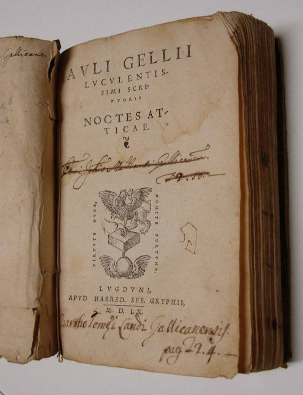 1565 Lugduni [Lyon] ; Haered Seb. Gryphii, 1565 - 1 volume petit In-12° 523 pages - Reliure d'epoque , velin , Dos à cnq nerfs , titre et date manuscrits au dos, parfait état . " Nuits Antiques "